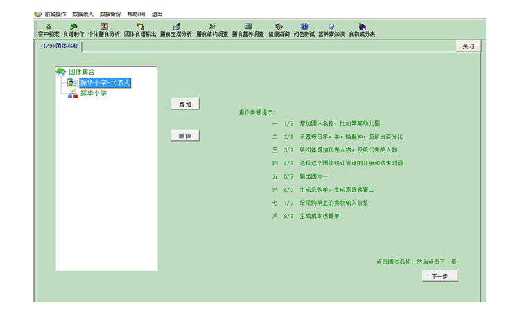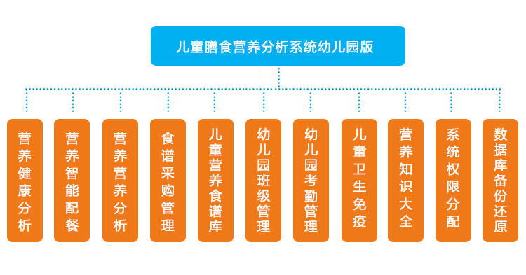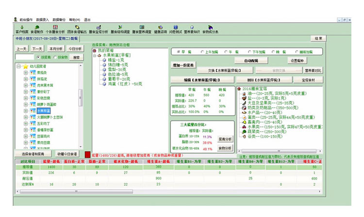 儿童膳食营养分析系统幼儿园版是集智能化营养配餐、幼儿管理、体检管理、膳食营养查询、采购管理于一体的专业软件。它能很方便地配制出既营养合格又食量适中的一周带量食谱表,并自动给出营养分析表、营养分析图及食物分类采购报价单。既可按食物分类快速点入,又可按营养素排序快速点入,无需中文打字,非常方便实用,是幼儿园营养配餐营养师有效操作工具。